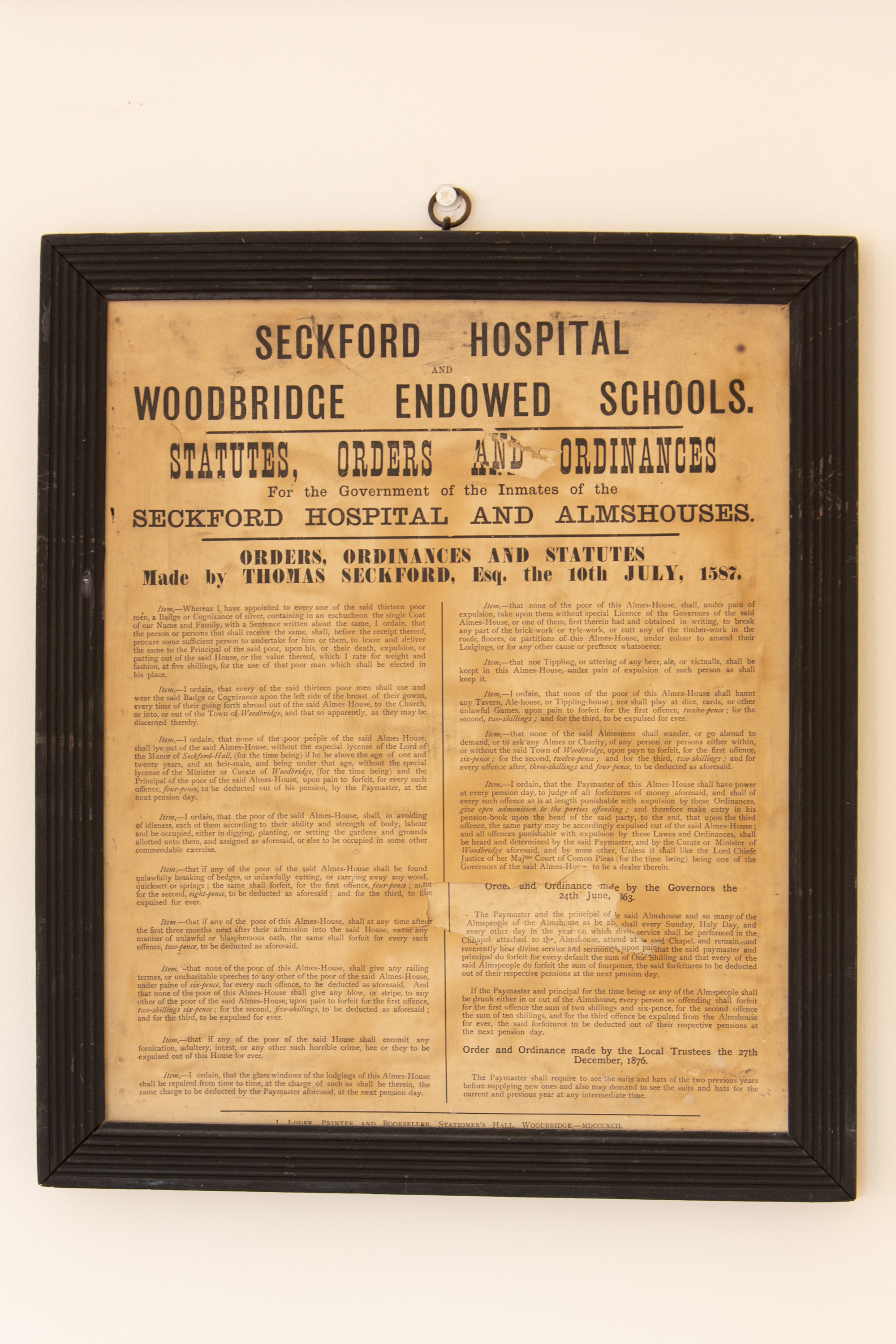 In 1587, Queen Elizabeth I granted Thomas Seckford permission to build almshouses in Woodbridge to ‘relieve need and distress’ amongst older people. The first Seckford Almshouse consisted of rooms of ‘brick and stone’ to house thirteen local men.